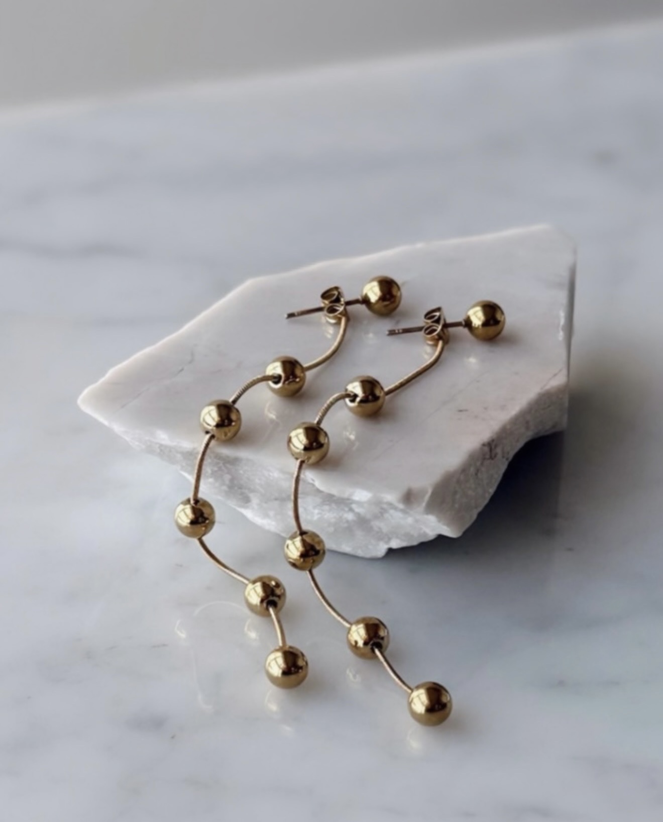 Este brinco é composto por esferas banhadas em ouro distribuídas ao longo de uma armação curvada, que confere movimento e charme ao acessório. Seu fechamento é do tipo tarraxa, garantindo segurança e praticidade. O banho dourado proporciona uma aparência refinada e destaca qualquer produção.