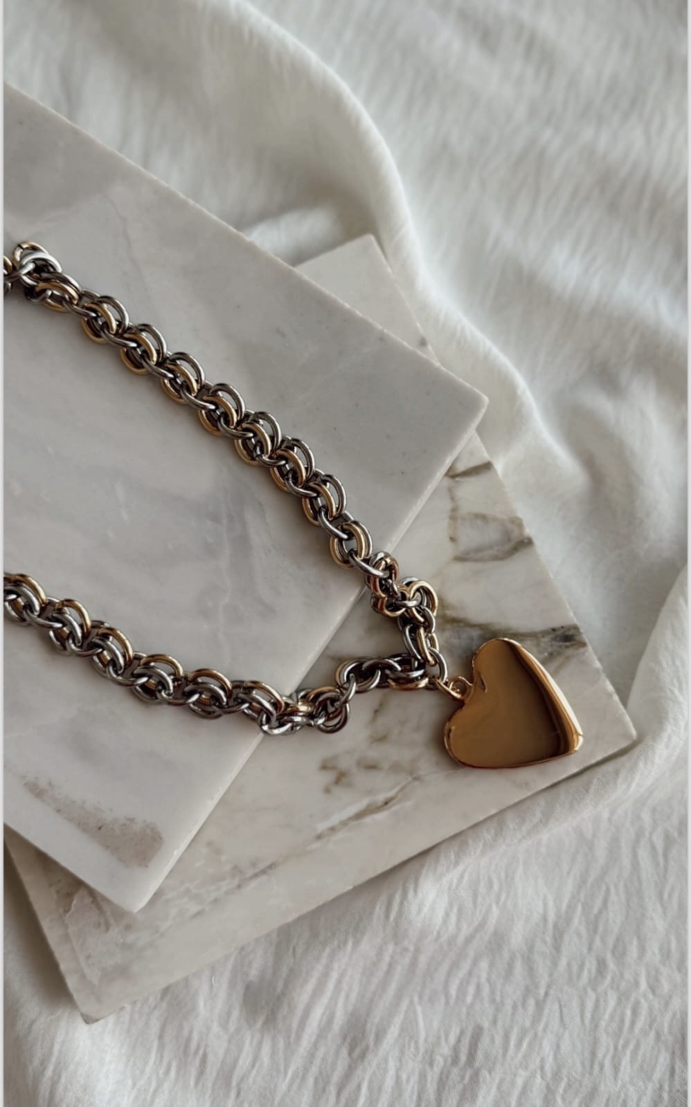 Colar de elos com banho duplo em ouro e ródio branco. O pingente em forma de coração banhado em ouro destaca-se pelo acabamento elegante, enquanto o fecho de imã facilita o uso com praticidade.