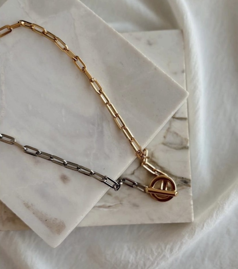 O colar apresenta elos menores, delicados no pescoço e com comprimento perfeito para destacar o estilo sem pesar. O banho duplo de cores adiciona um diferencial visual que integra facilmente com outros acessórios.