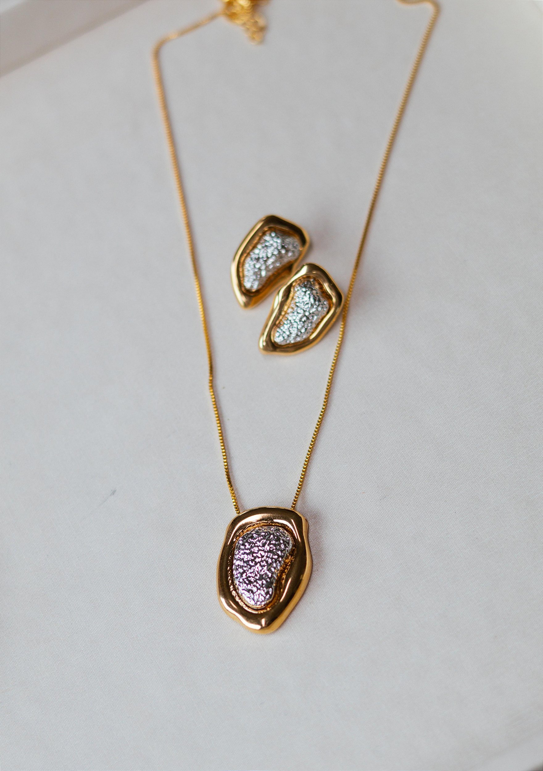 O conjunto traz colar com pingente e brincos que possuem banho duplo. As peças têm acabamento detalhado com relevos em tonalidades que valorizam o brilho dourado e o prata do ródio branco, combinando estilos.