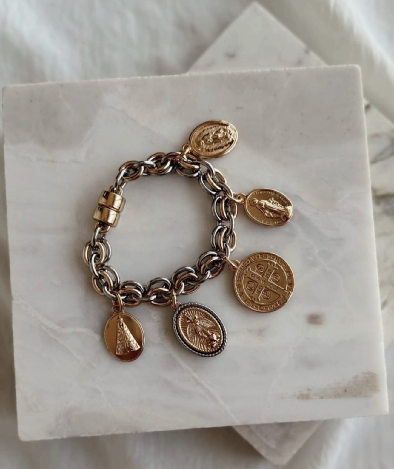 A Pulseira Sacra da Godoy Acessórios destaca-se pelo design com pingentes religiosos que unem fé e estilo. Com banho duplo em ouro e ródio branco, oferece resistência e brilho duradouro, além de fecho de ímã que facilita o uso.