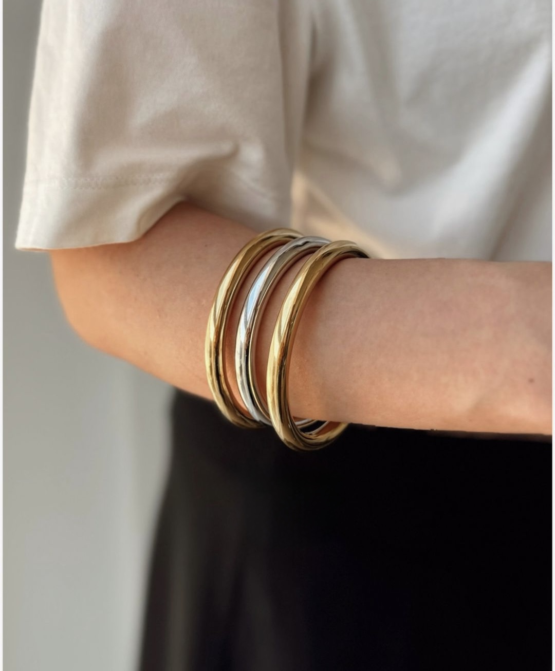 Os braceletes possuem acabamento liso e são ideais para serem usados juntos ou separados, compondo looks elegantes e discretos. O banho de ouro realça o brilho quente, enquanto o banho de ródio branco oferece um toque moderno e elegante. Perfeito para quem busca versatilidade e estilo em acessórios.